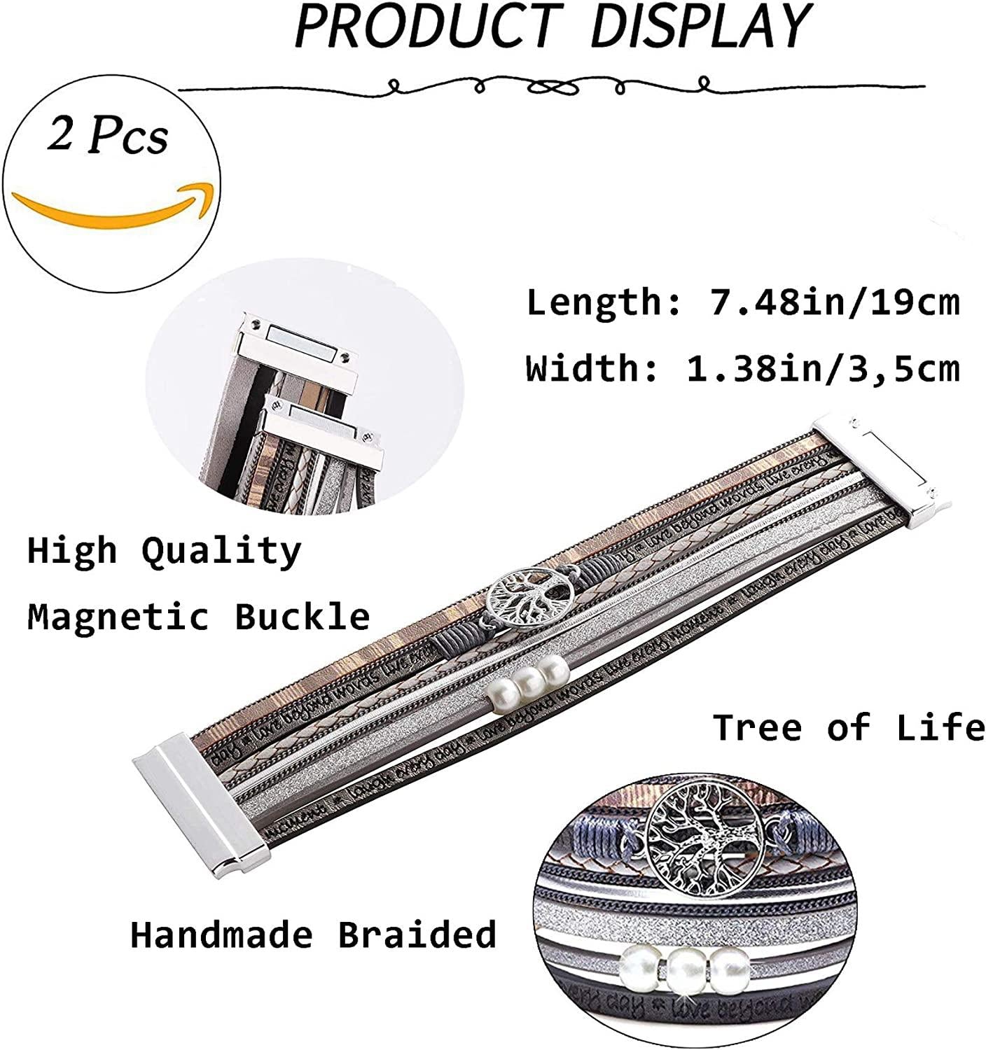 2Pcs Bohemian Leather Cuff Bracelet Gorgeous for Women Girls Multilayer Tree of Life Wrap Bangle Bracelets Set Gift for Wife Girlfriend Mother
