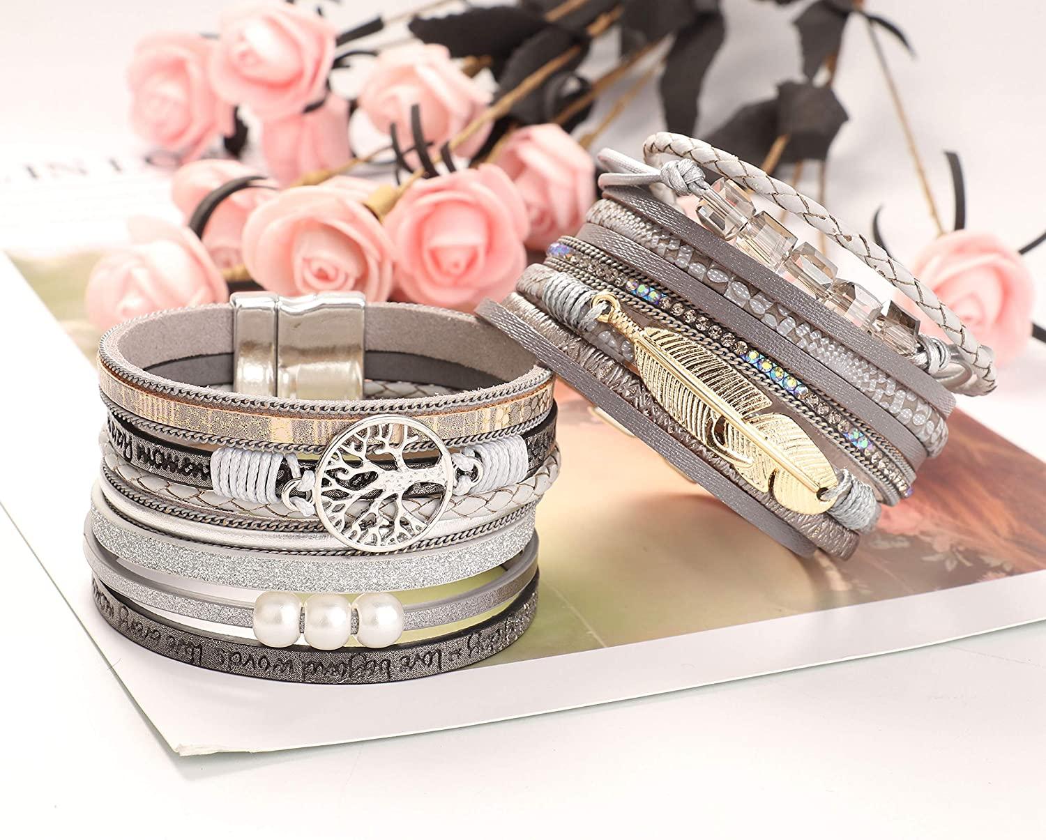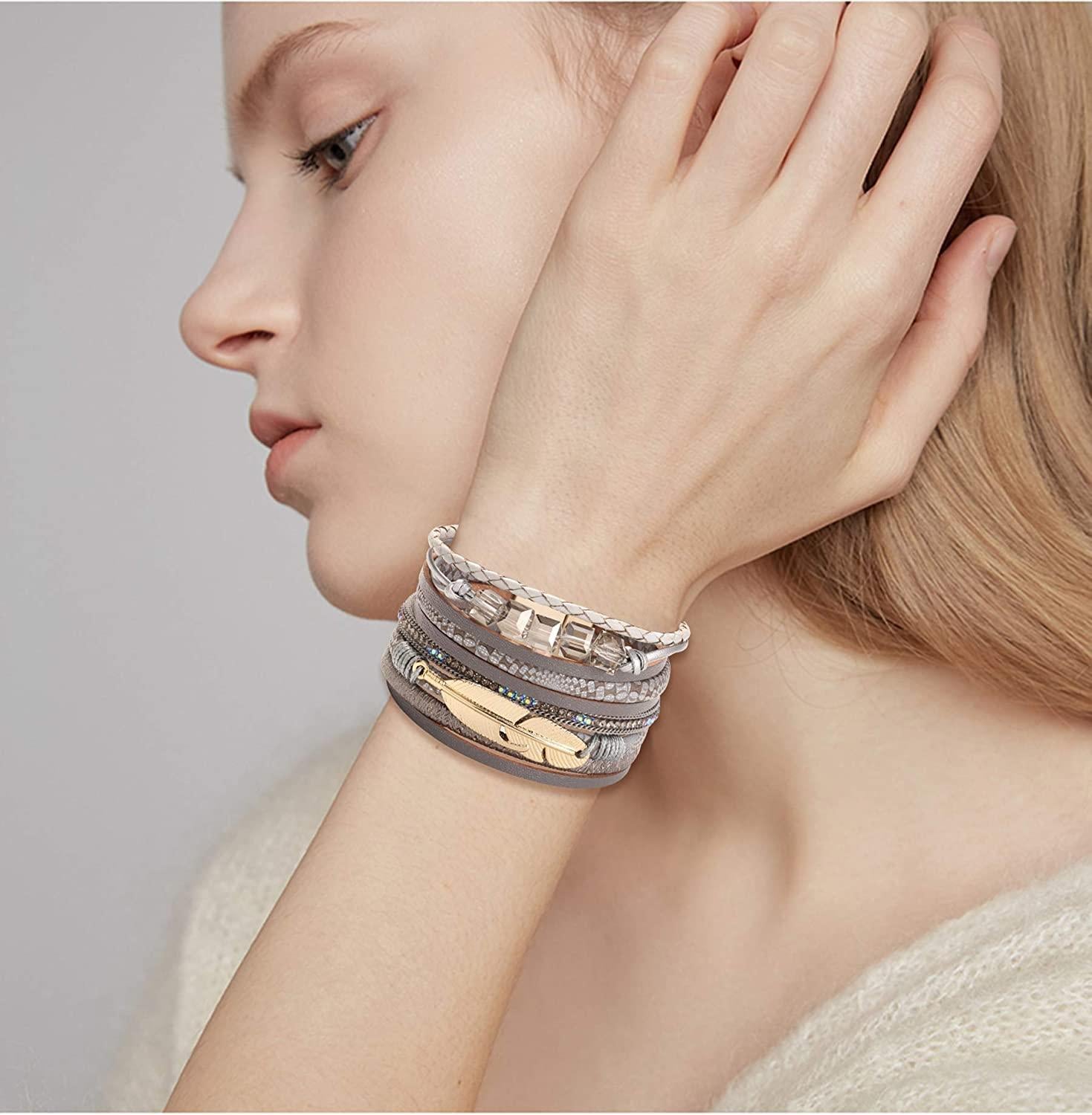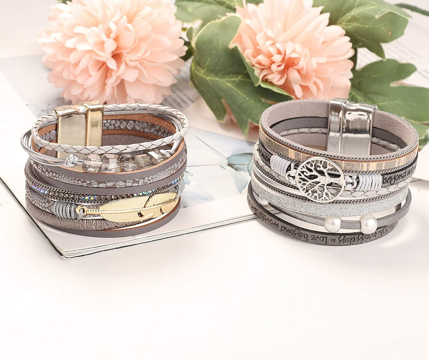 MULTI LAYER LEATHER WRAP BRACELET 2 style boho multi-layer leather bracelet set, multi-layer design, including gray, gold bracelet, perfect dress Your formal or party-like casual outfit, work, it's definitely an eye-catching leather bracelet, a unique bracelet jewelry for women and girls.