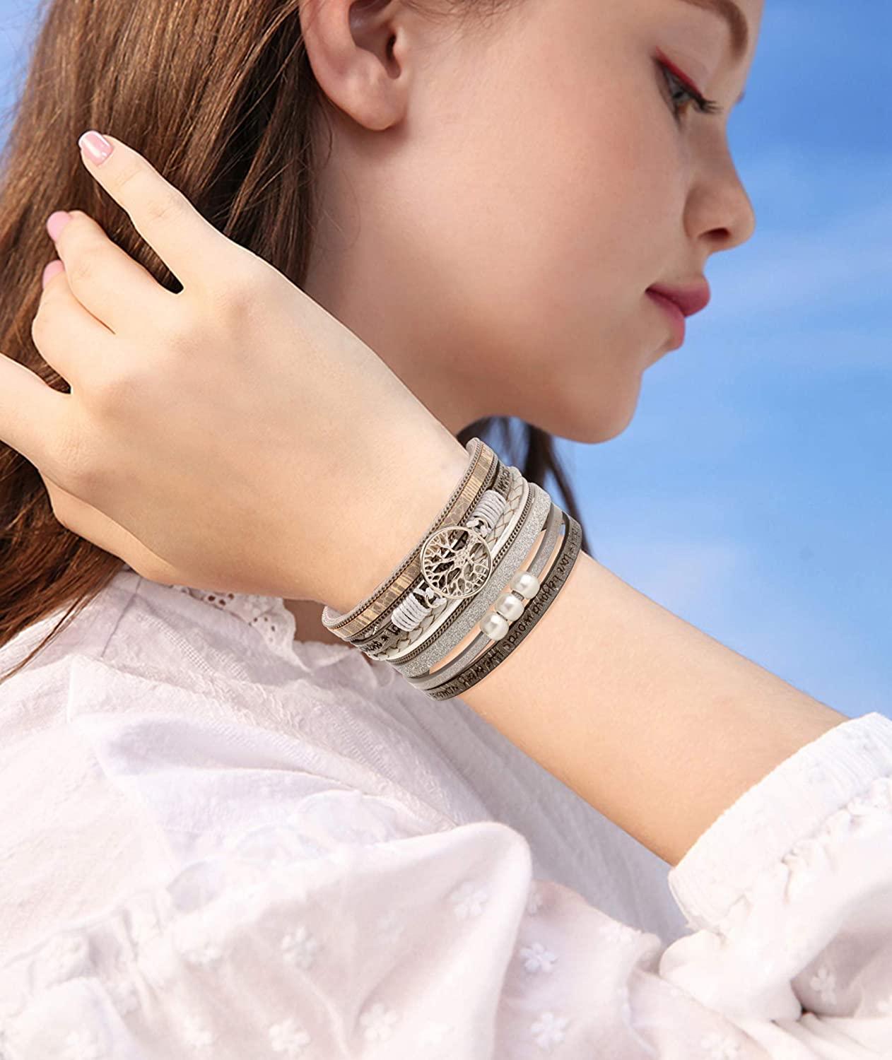COMFORTABLE WEARING Our women's leather bracelets are made of high quality leather and alloy, bracelet set and alloy tree of life charm, the perfect surface for durability, no fading, no spicy smell; use strong magnetic closure, no need Worried that it will loosen; 7.67 inches long and 1.37 inches wide, the most suitable for ordinary female or teen girls wrist size