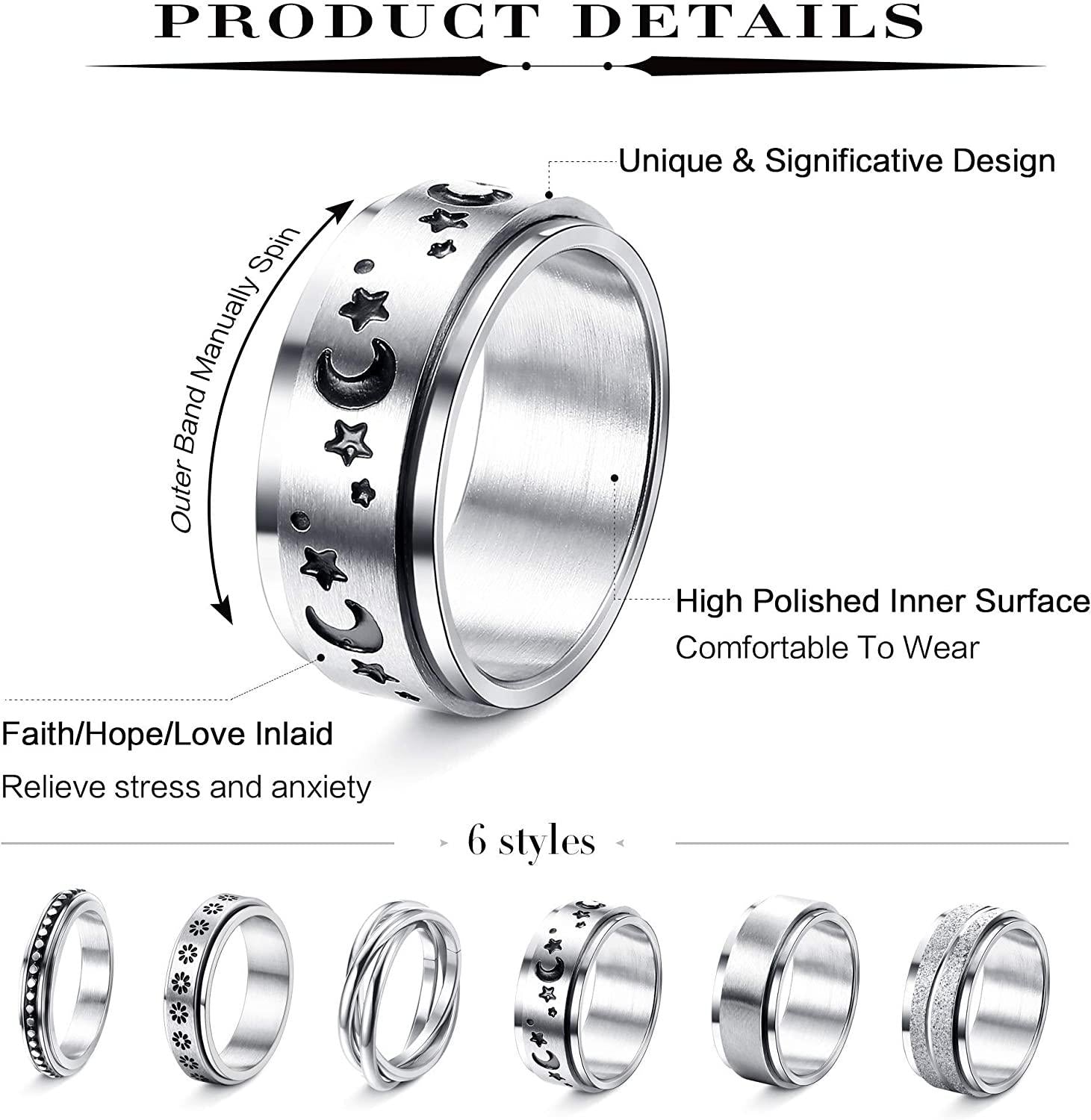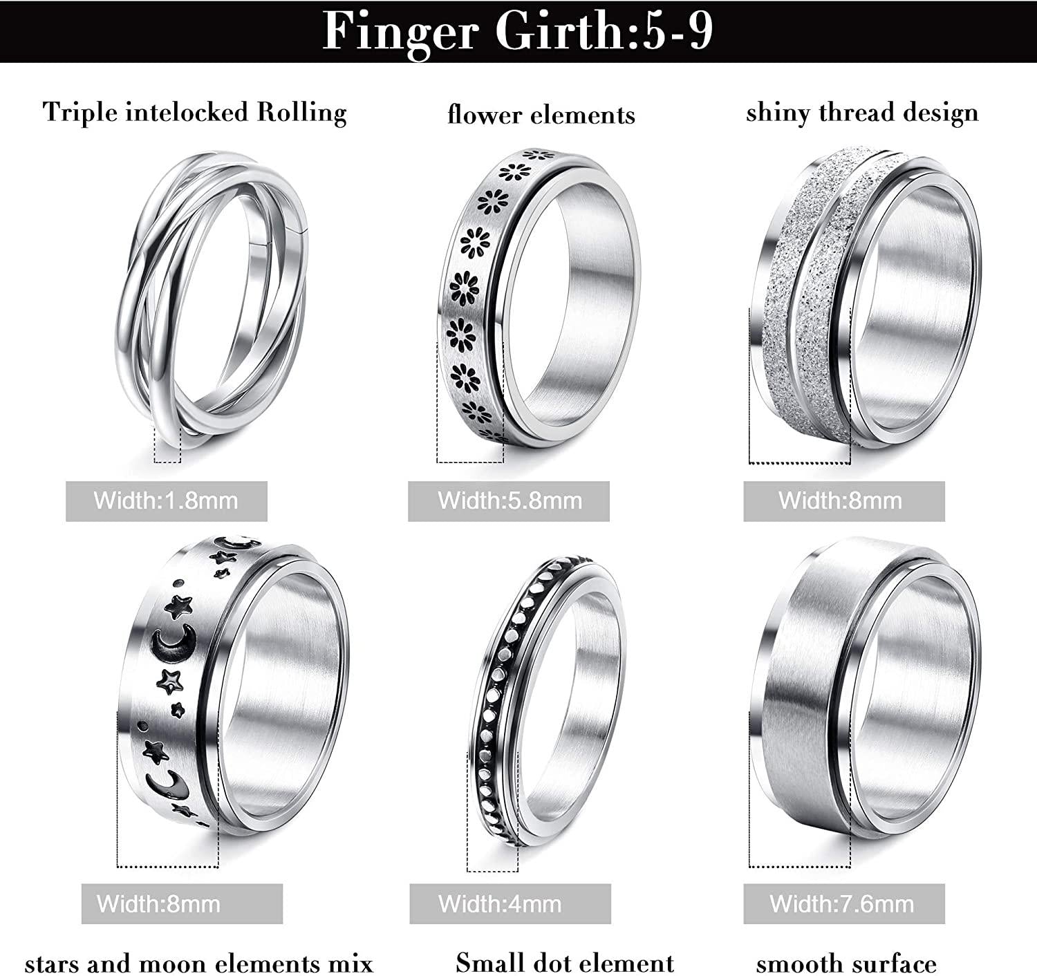 💡[FIDGET BAND RINGS]--An order contains six wedding promise band rings of different styles. Moon star fidget band ring, triple interlocked rolling ring, wide smmoth spinner ring, flower stress relieving meditation rings, sand blast finish wedding promise rings and point spinner ring. Our ring gets you through stress, anxiety and enhances your mood. Make you be attractive and unique. Can be worn on any finger.