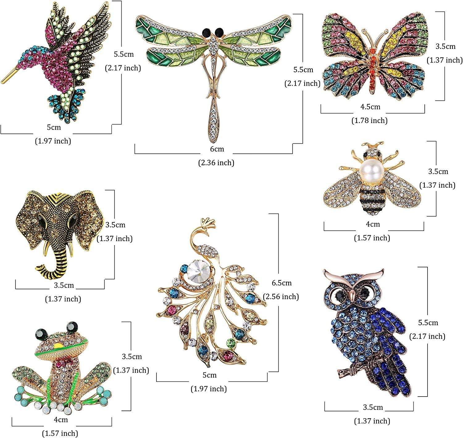 GREAT PACKAGING--One order includes Various Animals,like Frog,bee,Owl,Dragonfly,Butterfly,Peacock,Elephant and Bird,more choices for you.All animals are Very Detailed, Well Made, and Encrusted with Sparkling Glass Gems.You can add Glam to a Plain Colored Dress or Pin on Shawls and Scarves after you get them.Such an affordable package,dont you want it?