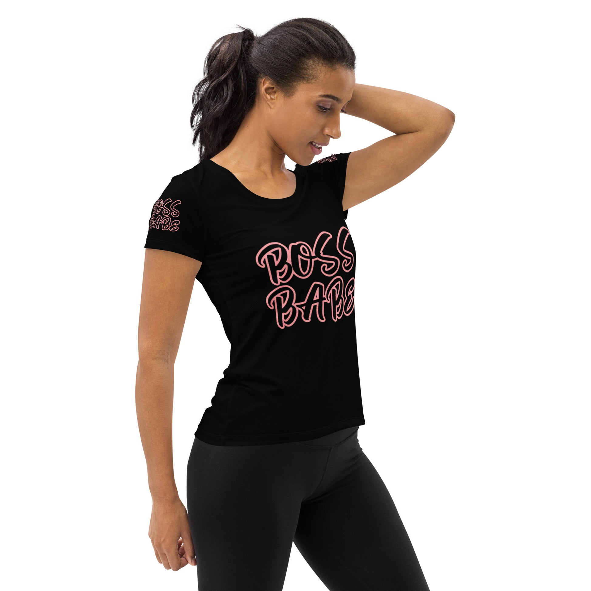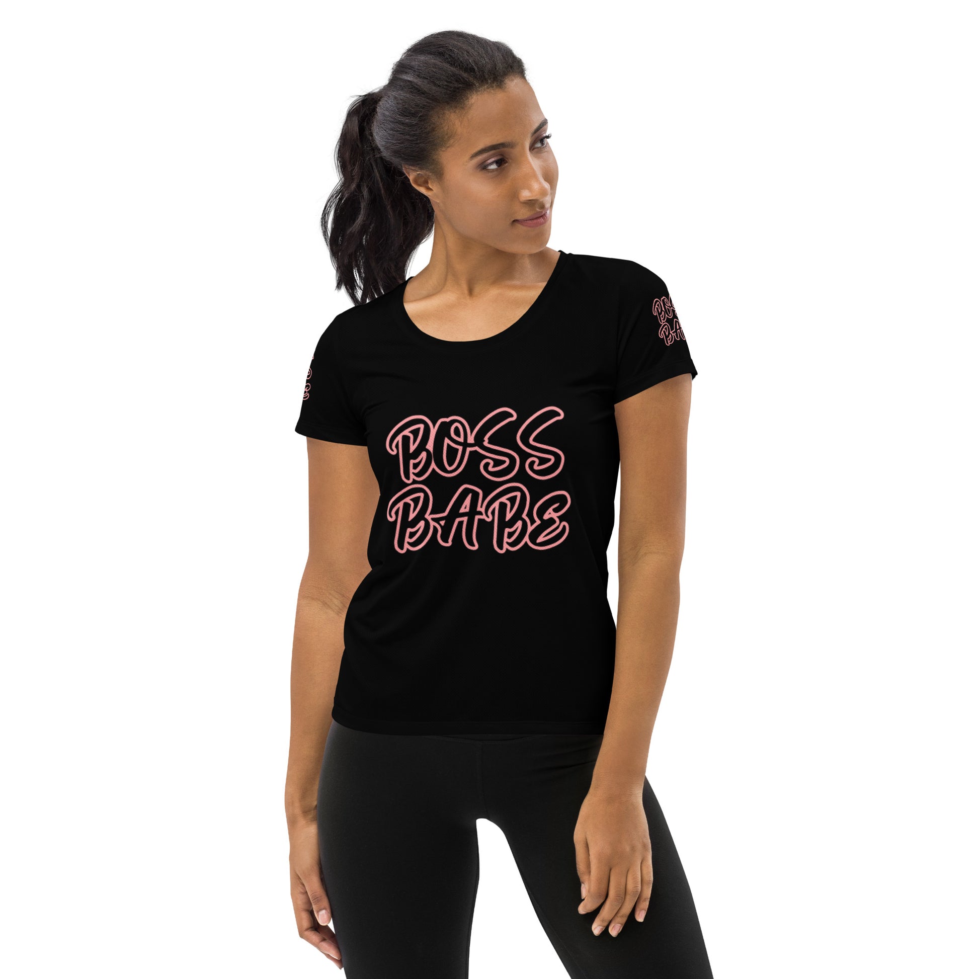BOSS BABE ON FRONT AND ON SLEEVES! PINK OUTLINE ON BLACK SHIRTAll-Over Print Women's Athletic T-shirt