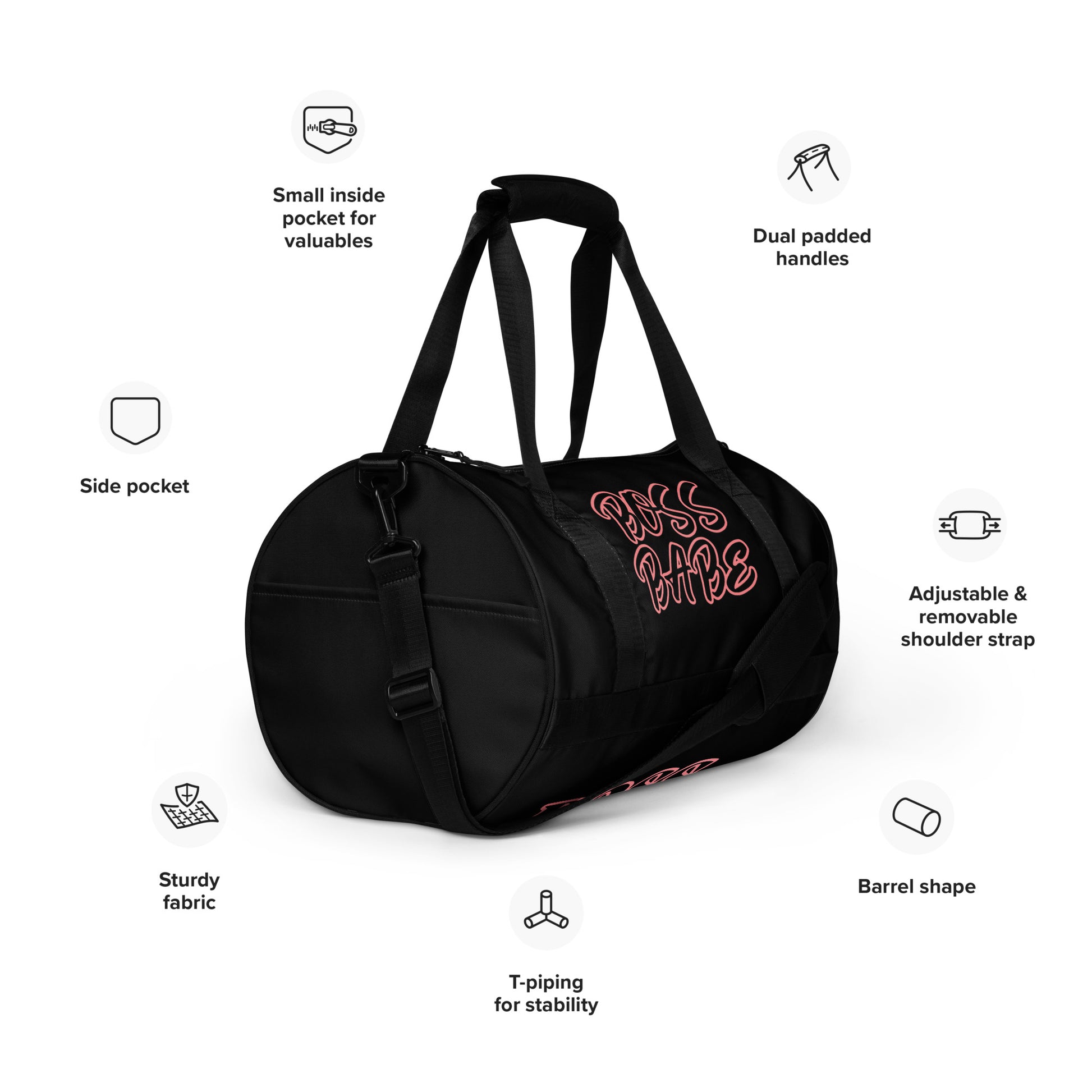BOSS BABE TRAVEL OR GYM BAG SHOWN WITH PINK OUTLINE ON BLACK BAG