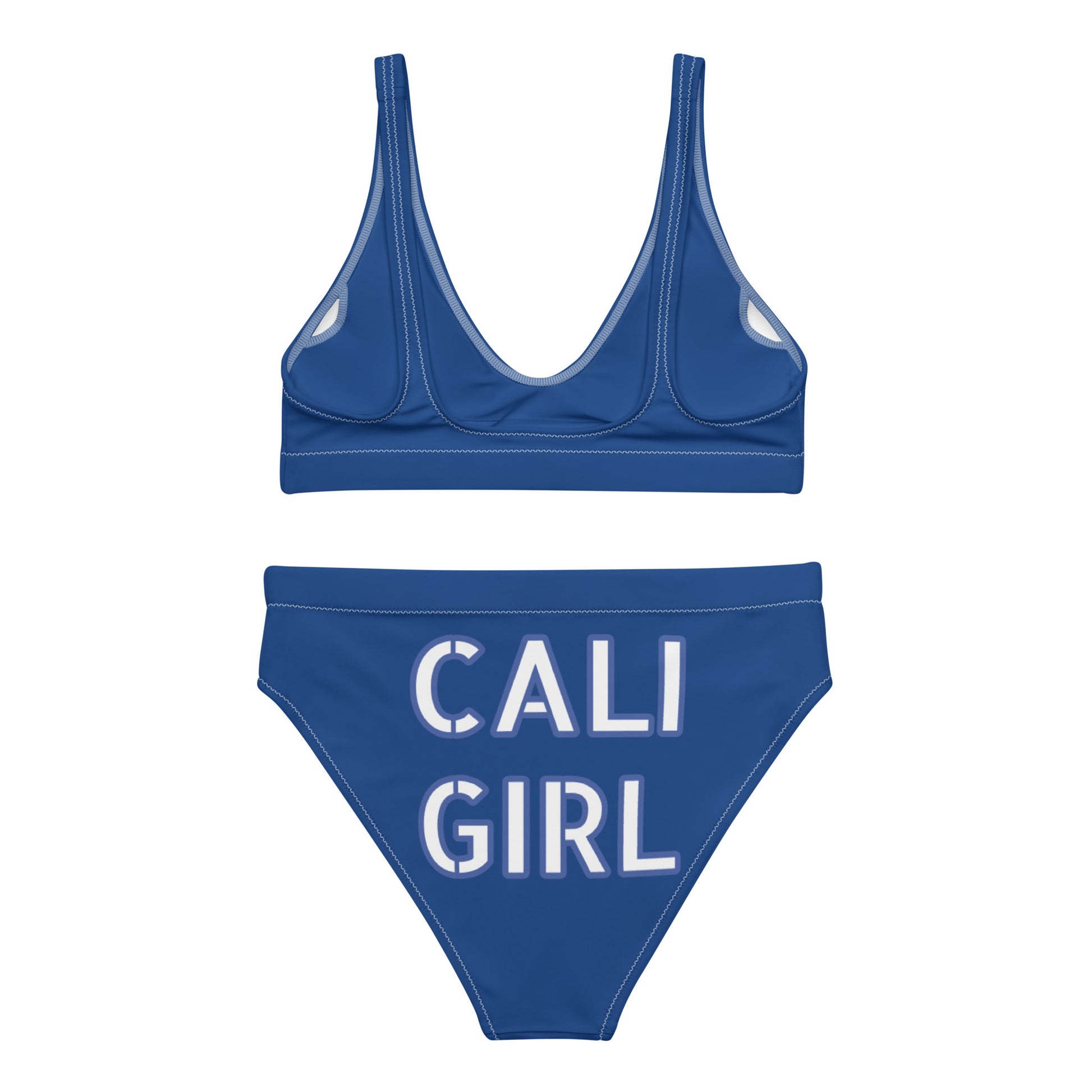 CALI GIRL--DEEP BLUE WITH WHITE WRITING--Recycled high-waisted bikini