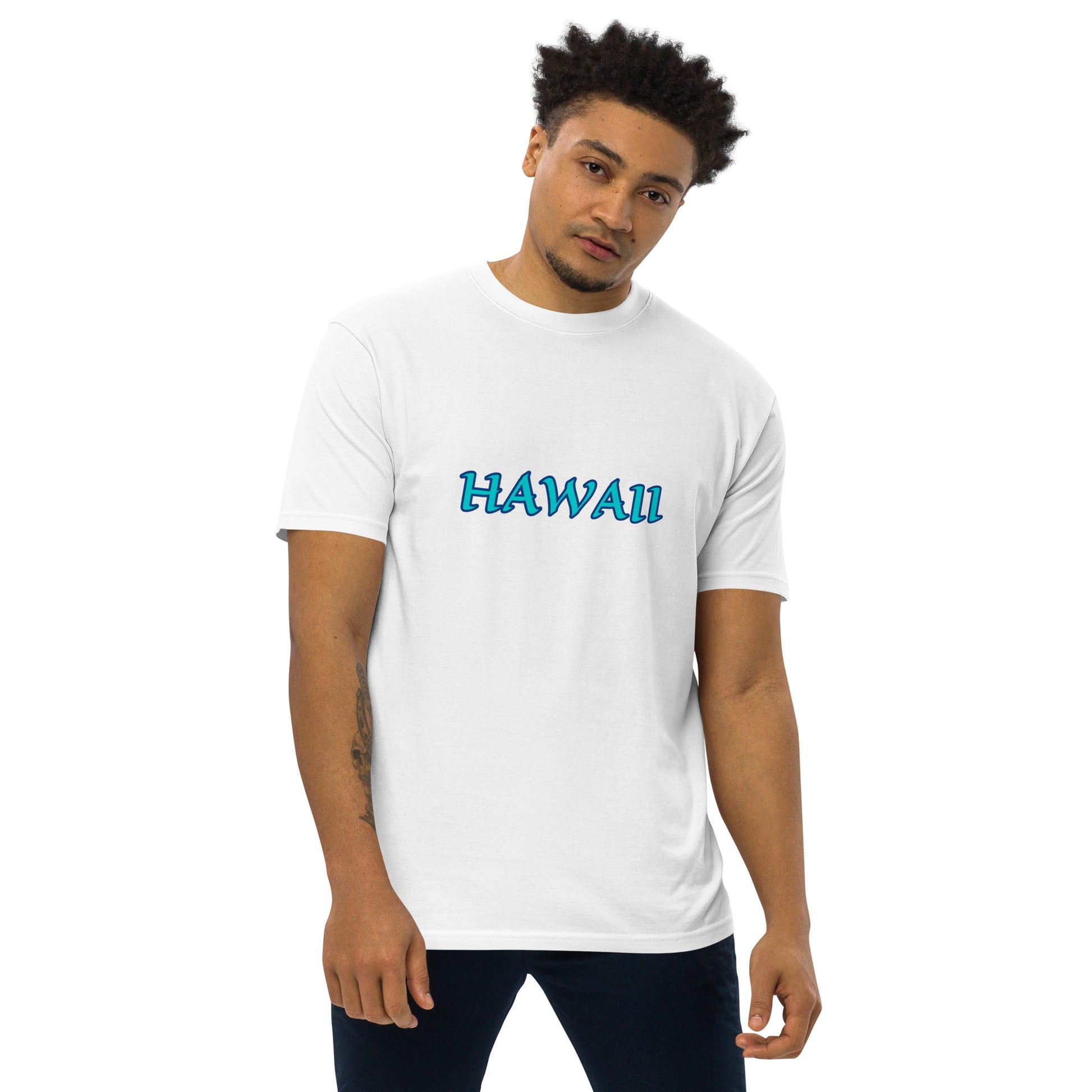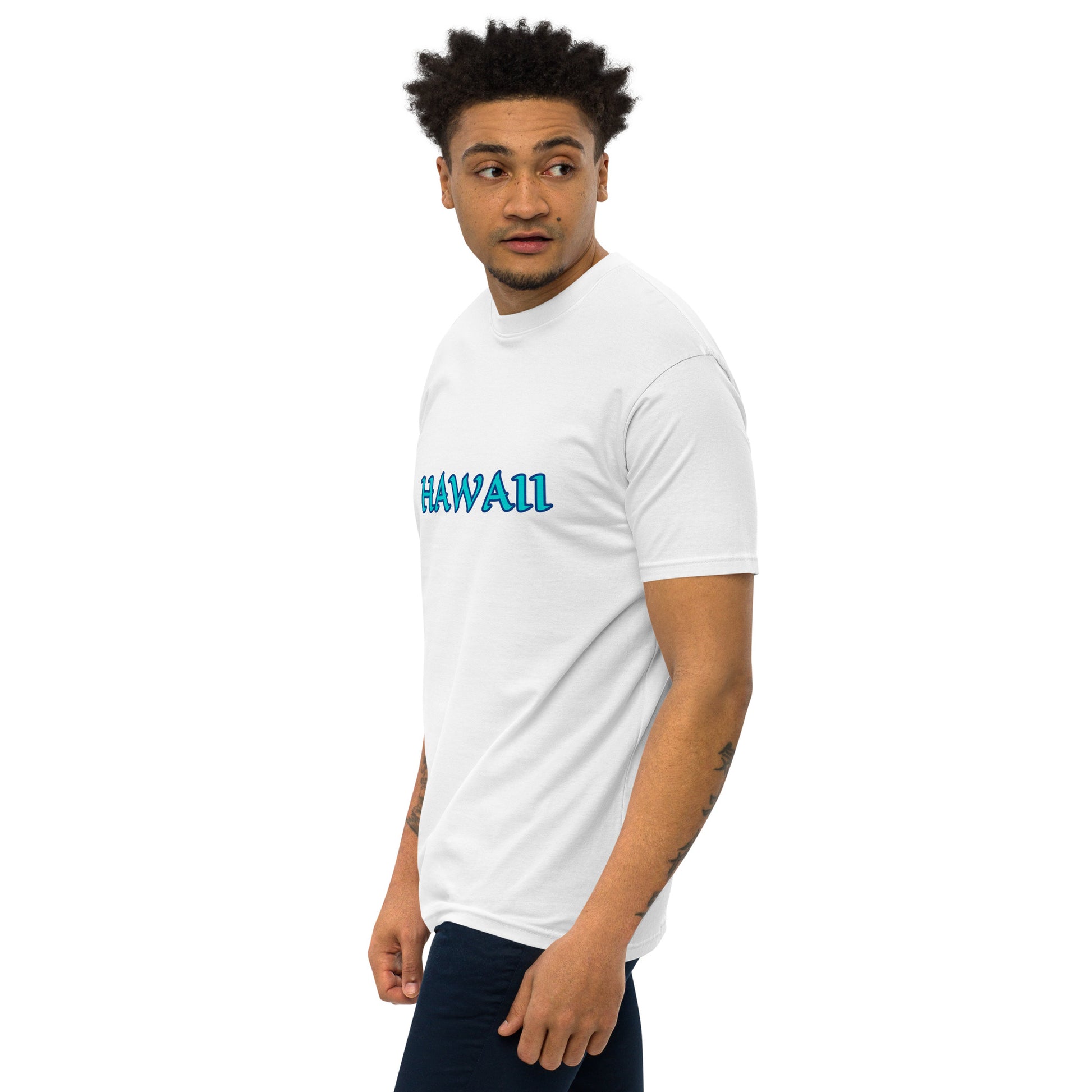 HAWAII WHITE SHIRT WITH WRITING IN TURQUOISE AND NAVY Men’s premium heavyweight tee