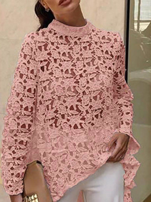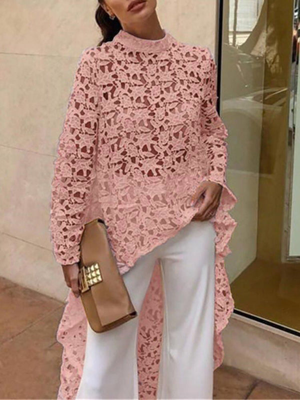 Ladies New Fashion Irregular Sexy Lace Long Sleeve Dress Tops