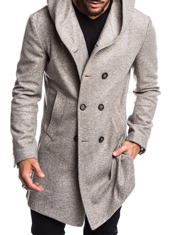 Men's Fashion Long Trench Coat Fleece Hooded Wool Jacket