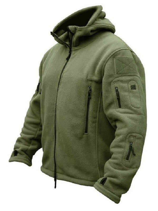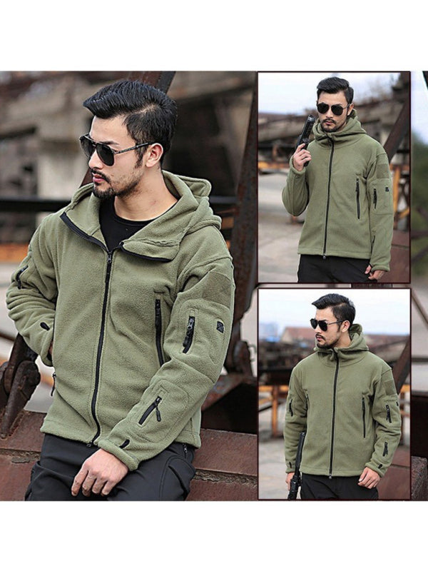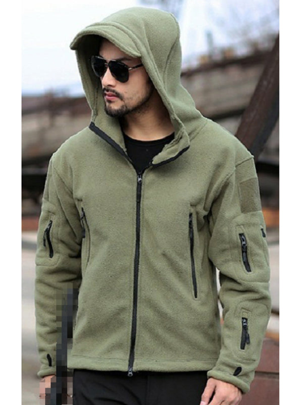 Men's Outdoor Warm Liner Fleece Jacket Cold-Proof Jacket Wind Hood Solid Color Hooded Jacket