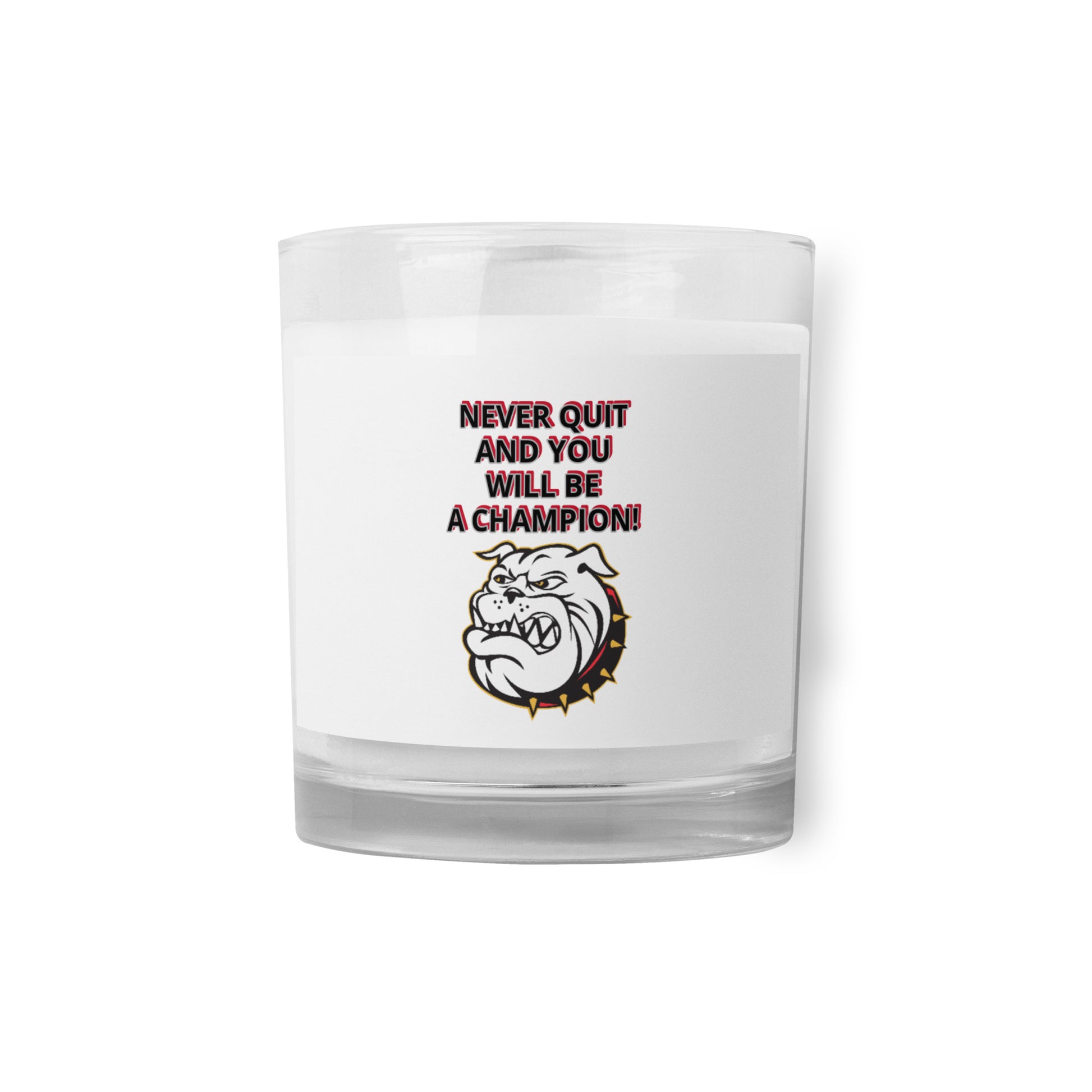 NEVER QUIT AND YOU WILL BE A CHAMPION! WHITE BULL DOG Glass jar candle