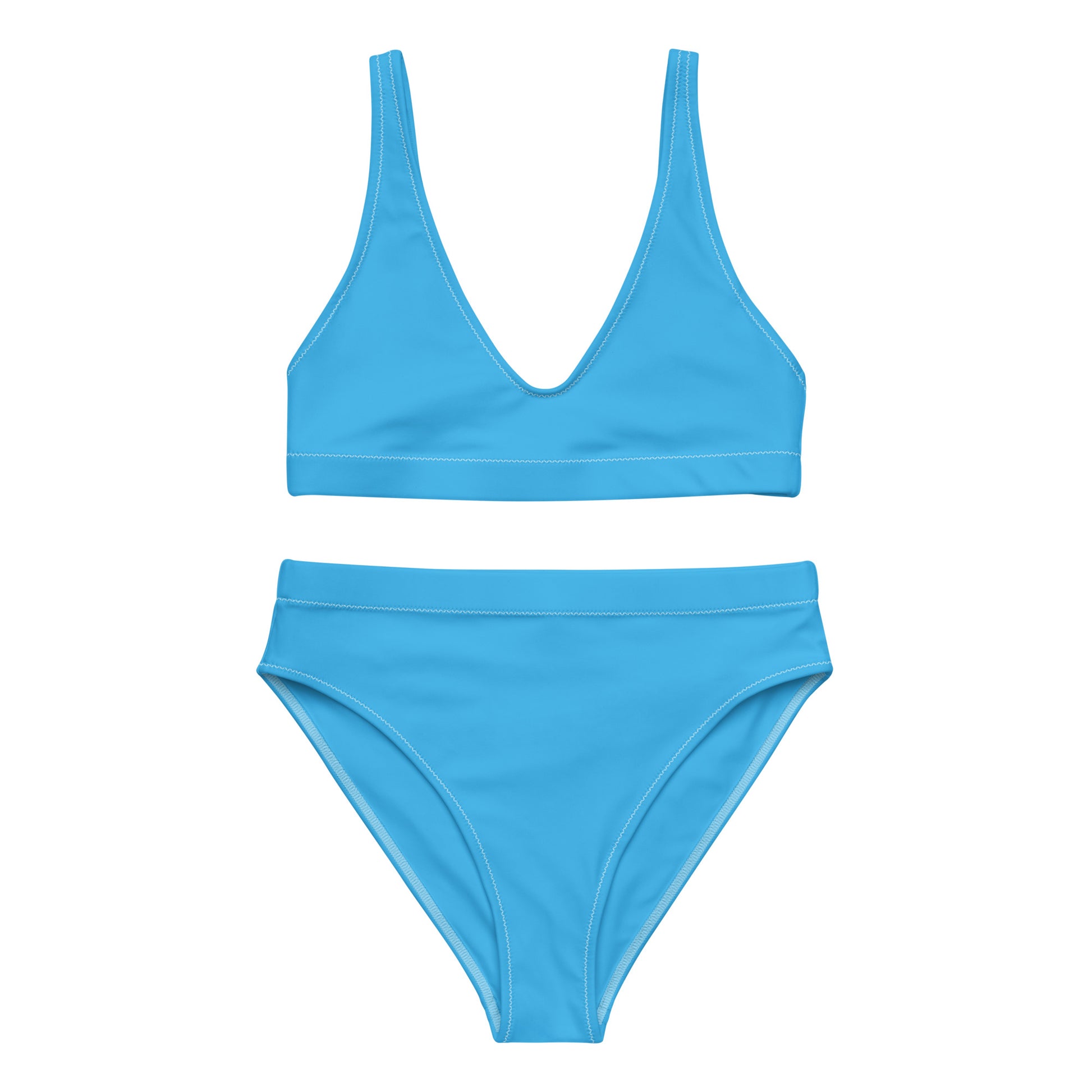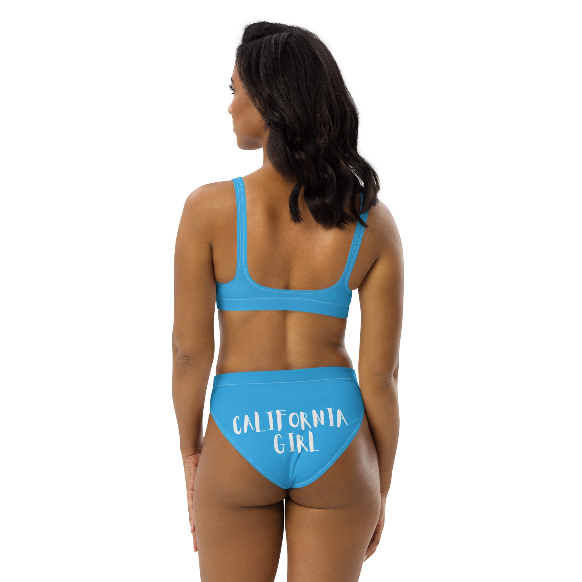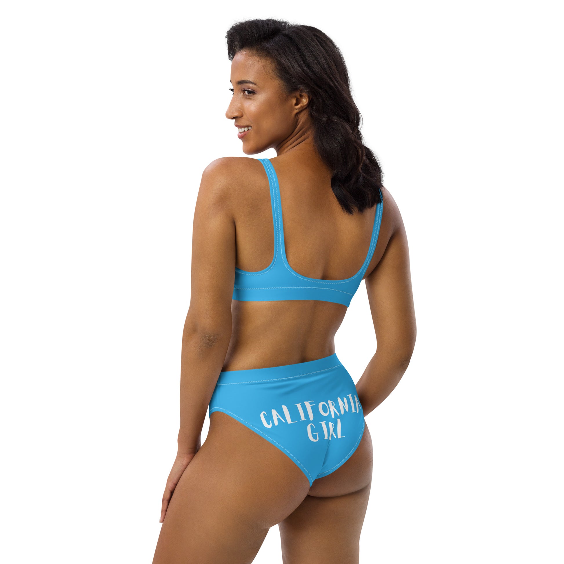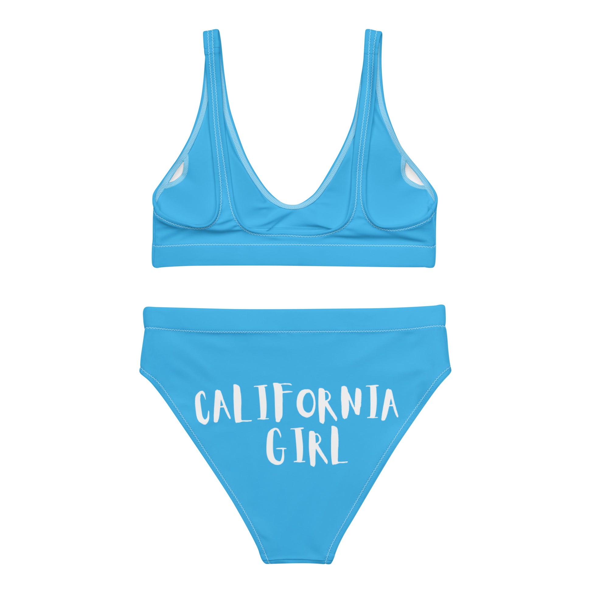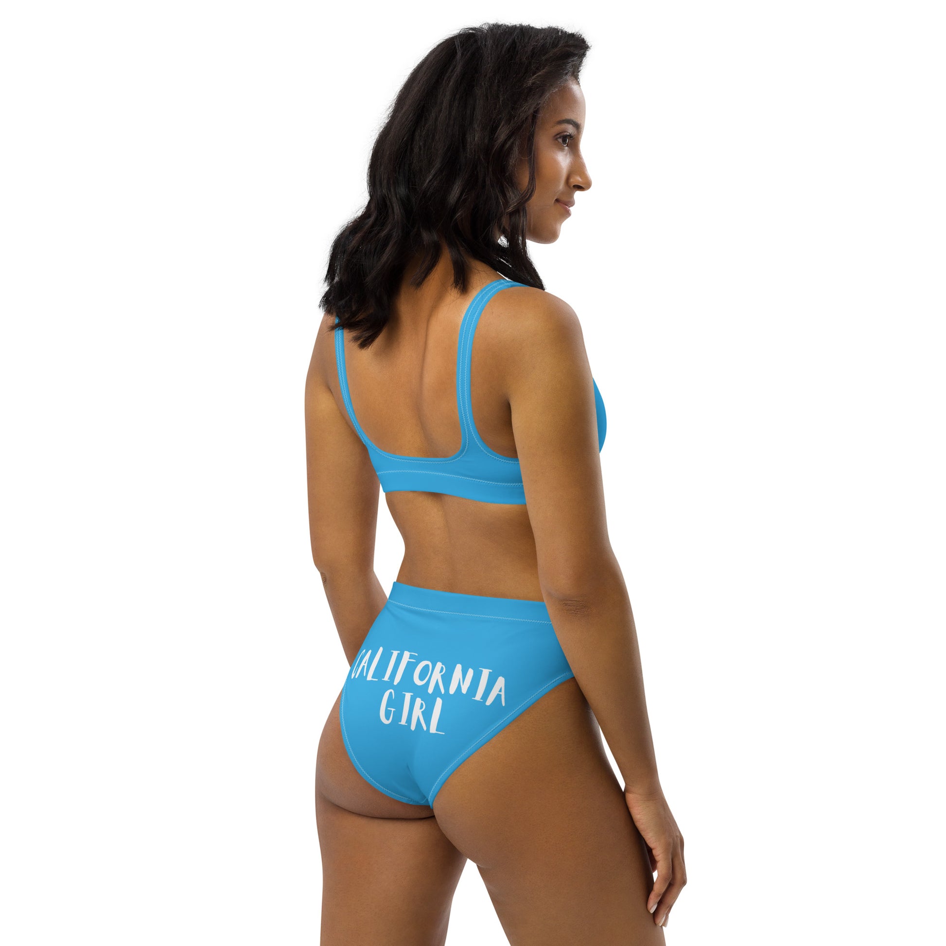 CALIFORNIA GIRL-- BLUE WITH WHITE WRITING Recycled high-waisted bikini