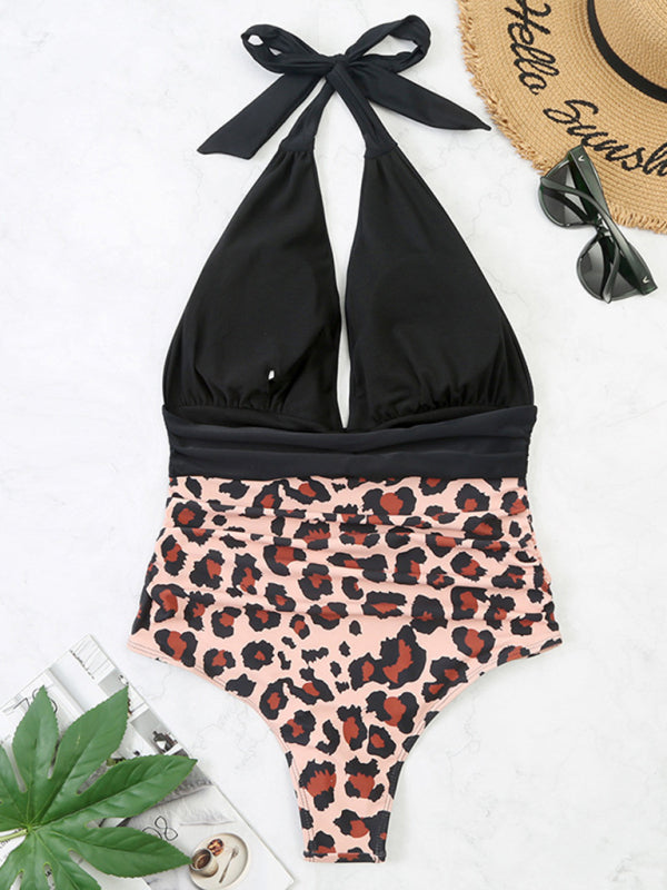 Swimsuit women's one-piece halter sexy color-block belly-covering bikini swimsuit