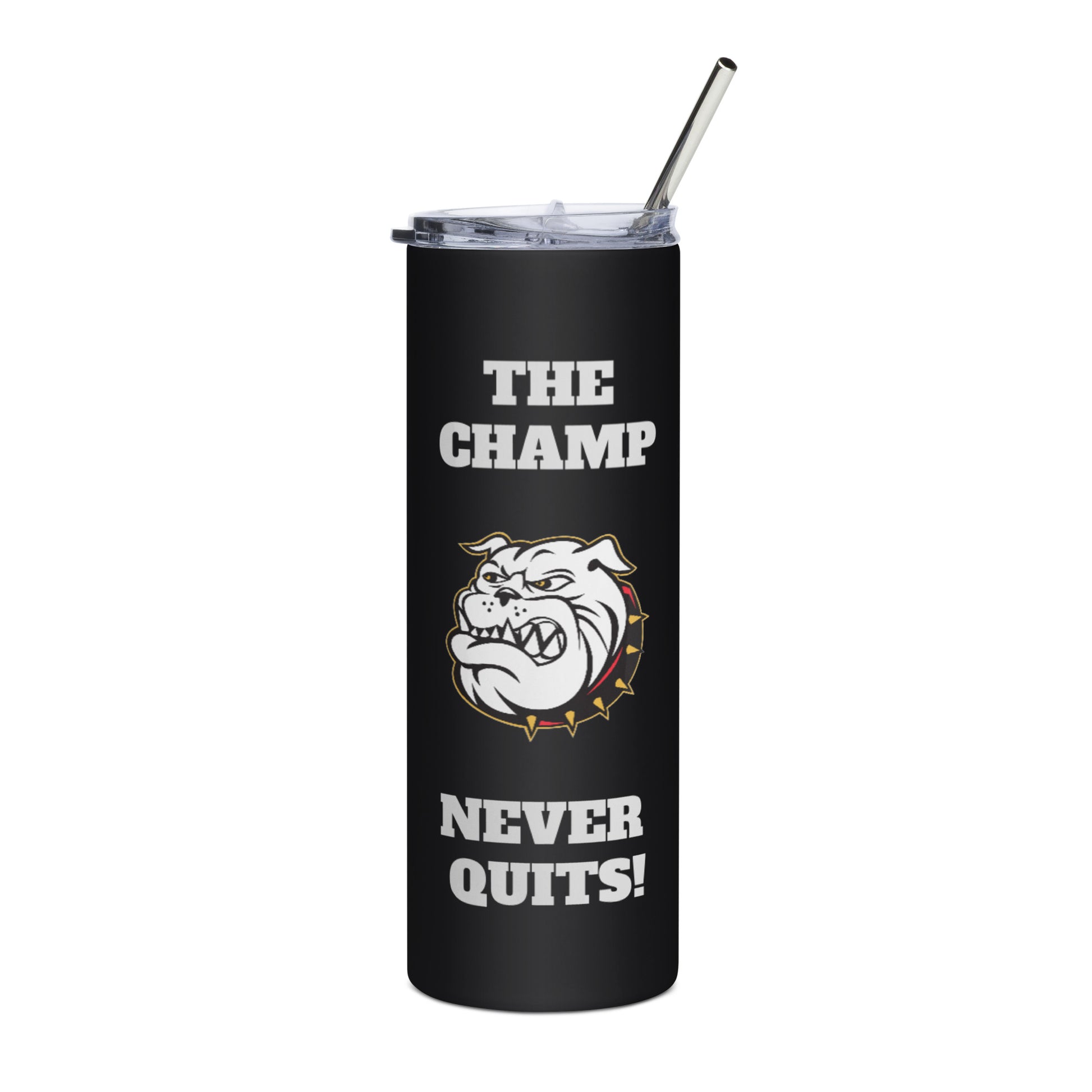 THE CHAMP NEVER QUITS! BULL DOG IN WHITE Stainless steel tumbler