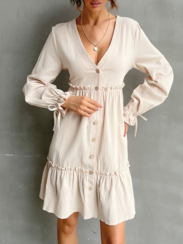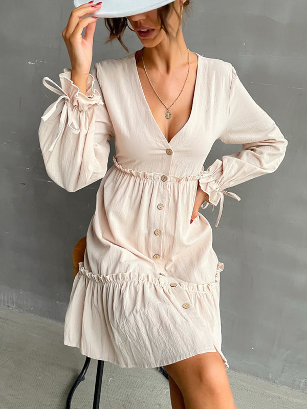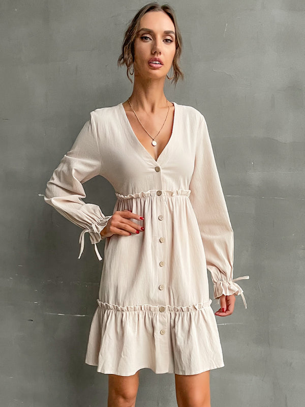 Women’s Dainty Button Down Long Sleeve Dress With Ruffles An Wrist Ties