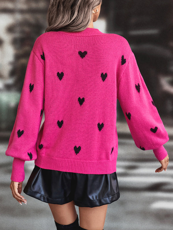 Women’s Heart Print Sweater With Mock Crew Neckline And Dropped Shoulders