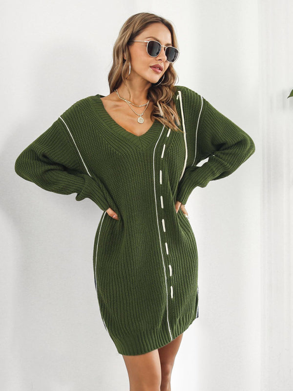 Women's Dropped Sleeves Drawstring V-Neck Sweater Dress
