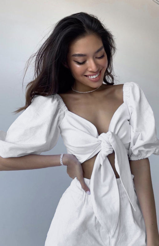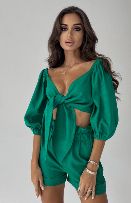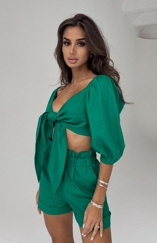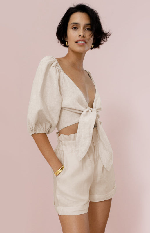 Women's Fashion Sexy Cotton Linen Cardigan Top Pocket Shorts Casual Suit