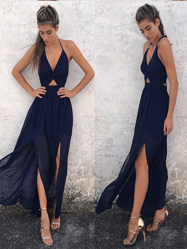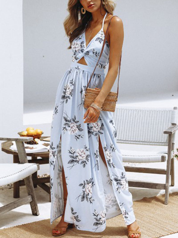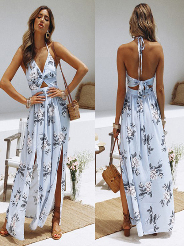 Women's halter V-neck chiffon print dress sexy split beach dress