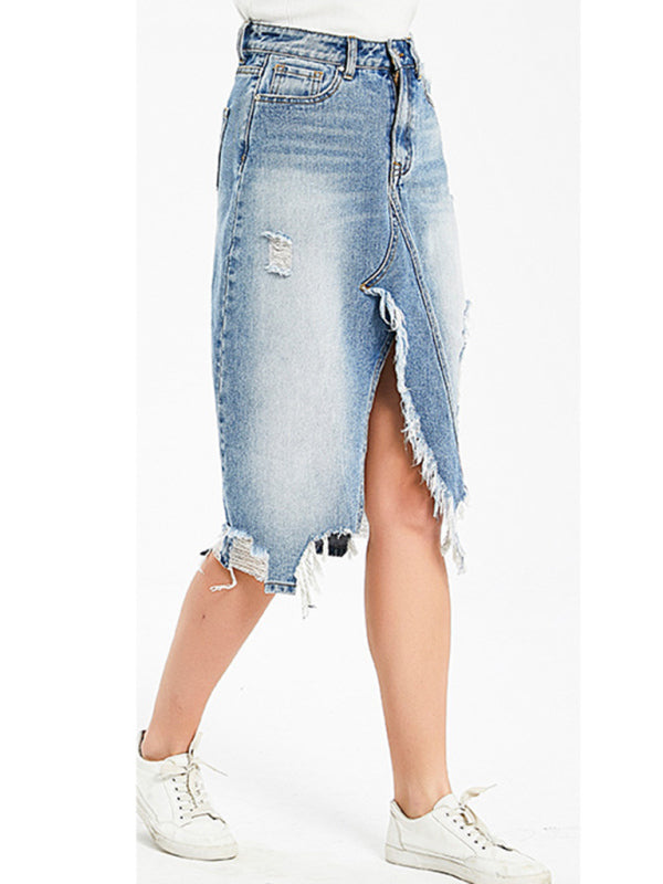Women's Irregular fringed ripped butt-lifting denim midi skirt