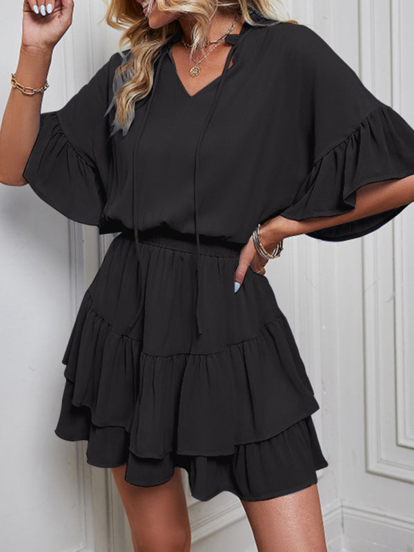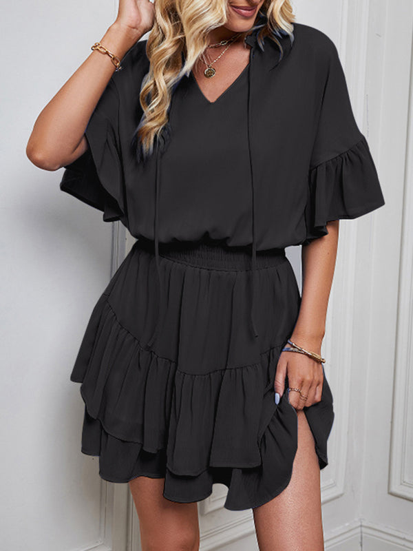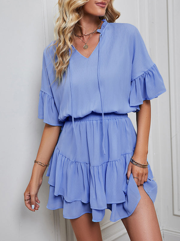 Women's Solid Color Flutter Ruffle Sleeve Tie Neck Minidress