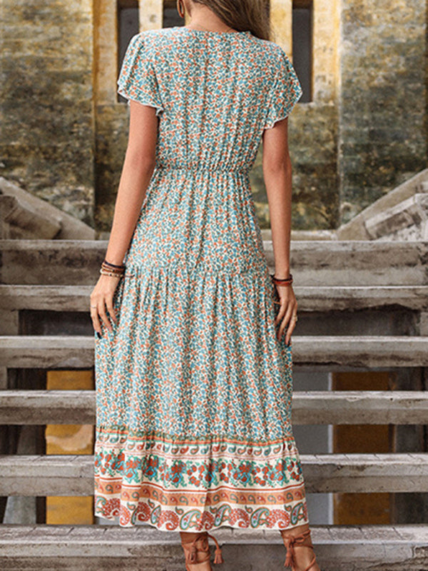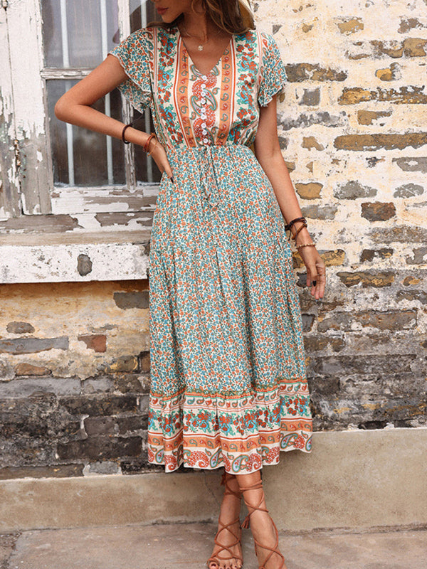 women's summer retro print green slimming dress