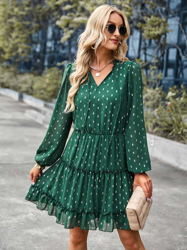 Women's V-neck sexy waist closed long sleeve A-line skirt dress