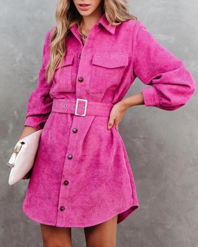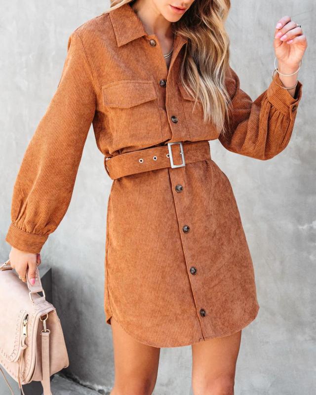 Women's casual solid color corduroy tie shirt dress